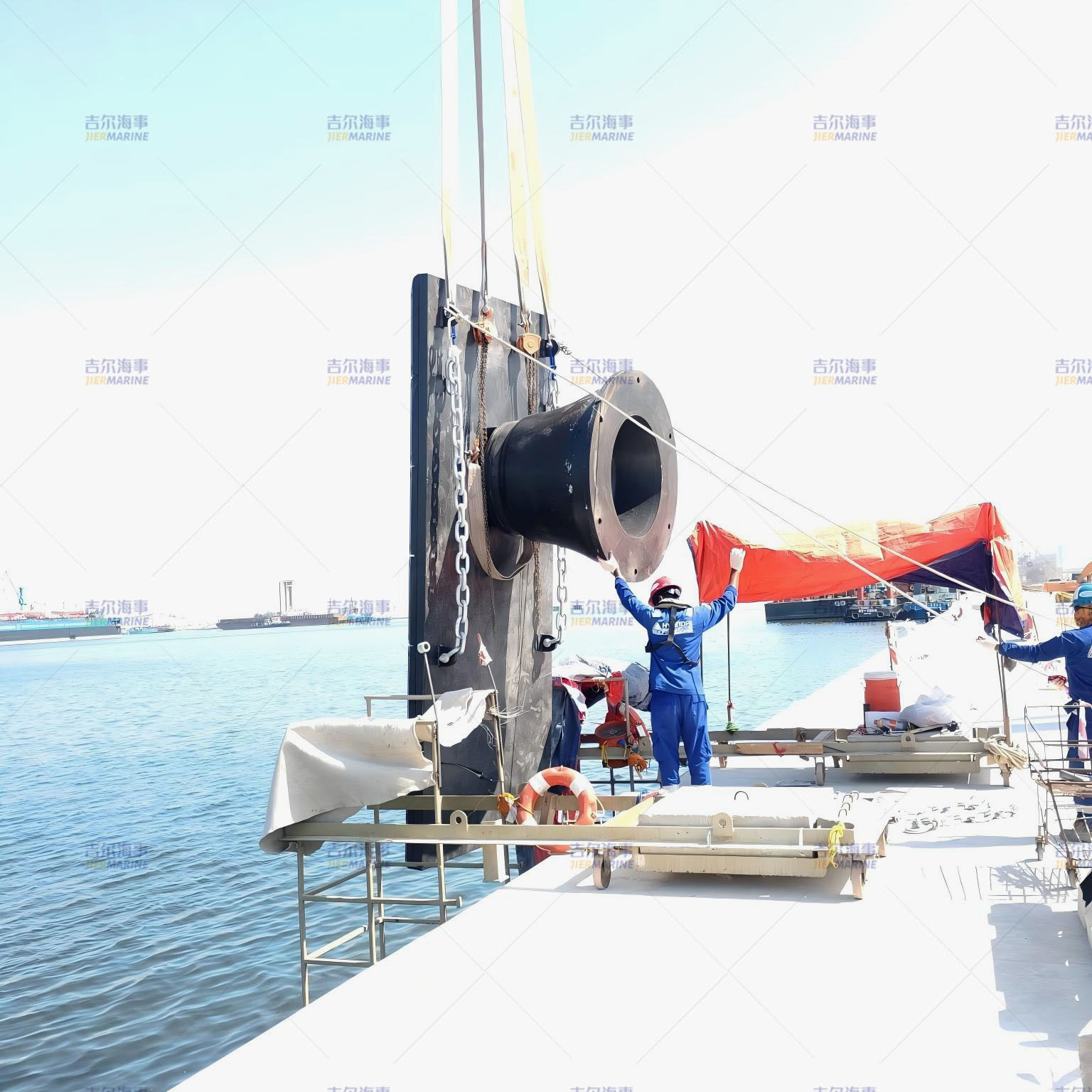 • 作业人员配合指挥信号,缓慢将护舷对准预埋件,严禁人员站立于吊物下方或边缘危险区域。